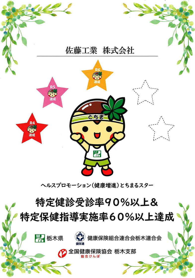 弊社では、栃木県の『とちぎ健康経営事業所』の認定を受けています。
