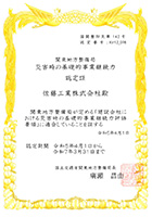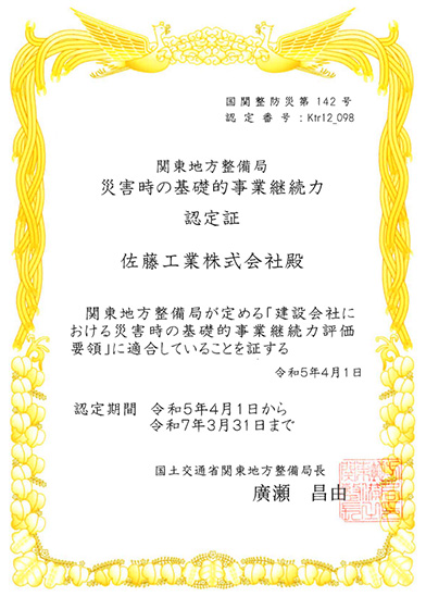 (国土交通省関東地方整備局より「災害時の基礎的事業継続力」の認定を受けています。)