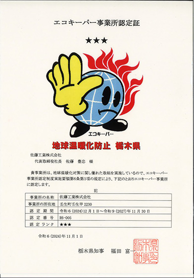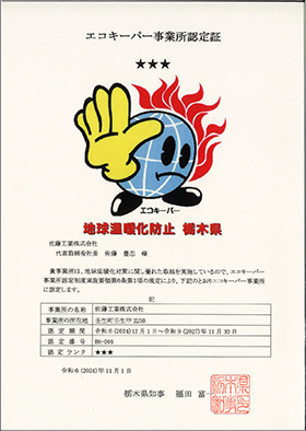 栃木県よりエコキーパー事業所の認定を受け、地球温暖化防止対策に取り組んでいます。