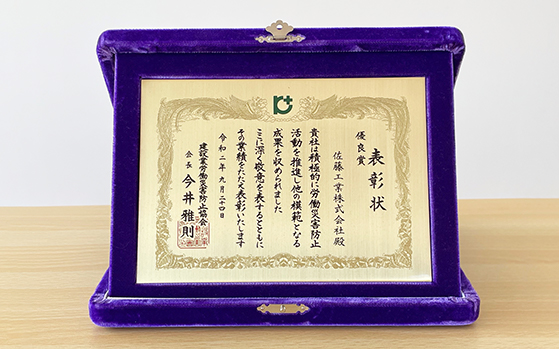 令和2年に、建設業労働災害防止協会より優良賞の表彰を受けました。